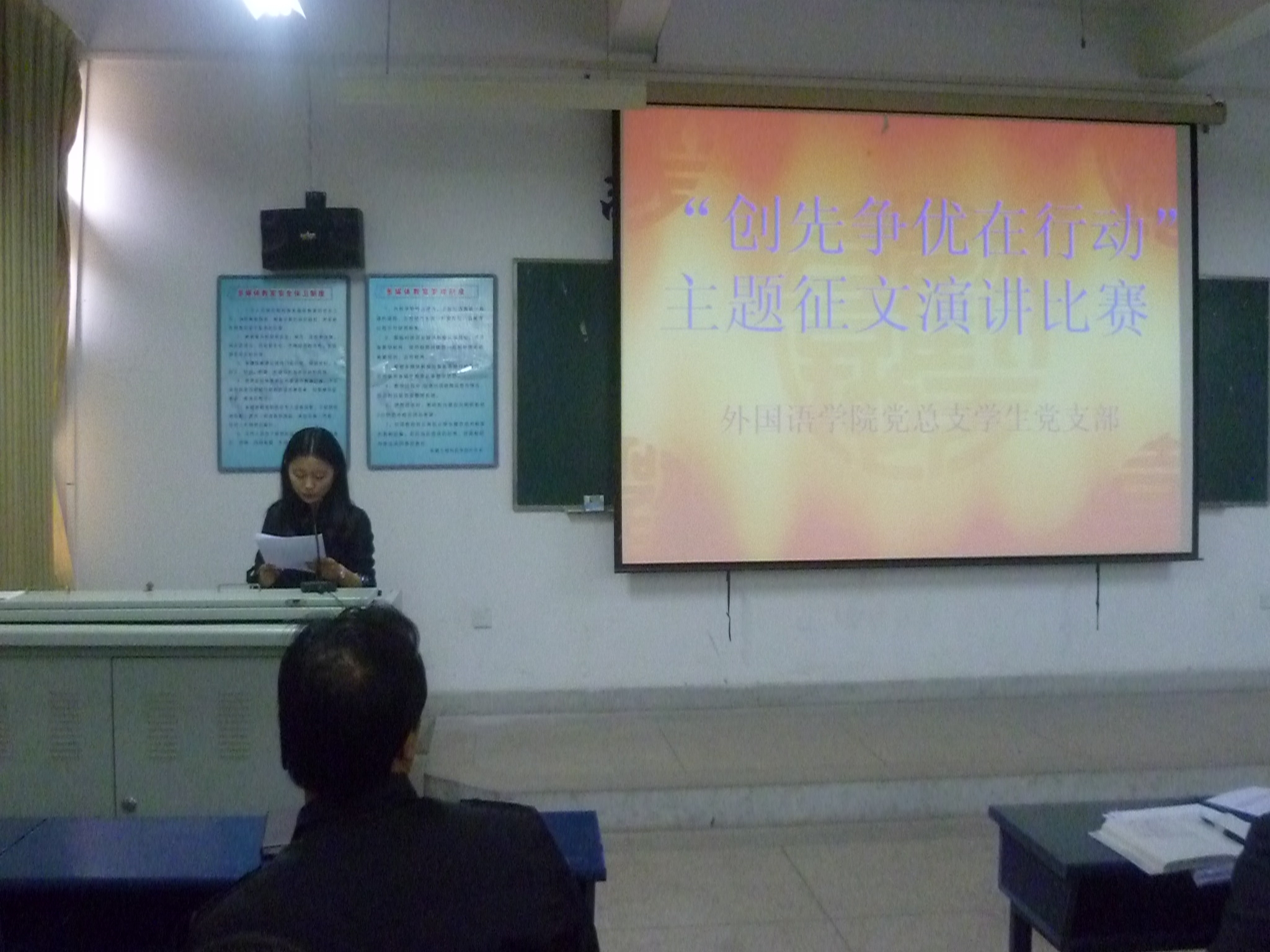 在全党上下开展“创先争优”活动之际,在建党90周年即将到来之时,4月30日下午,外国语学院学生党支部在9教101教室举行了学生党员“创先争优在行动”主题演讲比赛暨“创先争优”党员公开承诺大会活动。院党总支副书记谈丽华,学生党支部书记、团总支书记李烨及全体辅导员出席了此次活动。活动由