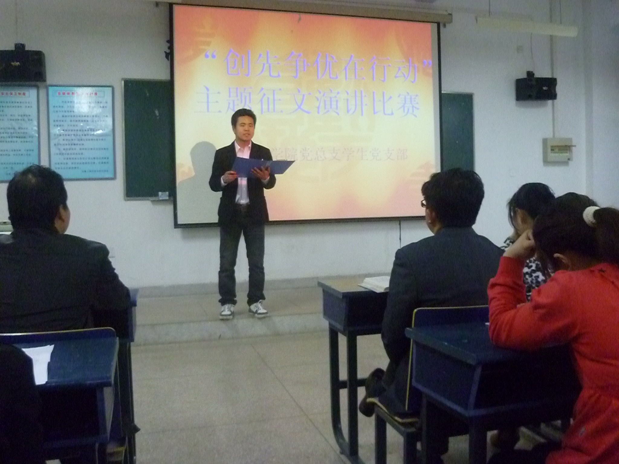 活动第一项,由各班推荐的八名选手依次上台演讲,选手们精神饱满,激情高昂,他们围绕“创先争优在行动”的主题娓娓道来,有结合建党90年的历程谈当代大学生的责任,有谈自己对创先争优的理解,有结合“五好”、“五带头”的目标谈自己的实际行动。院领导