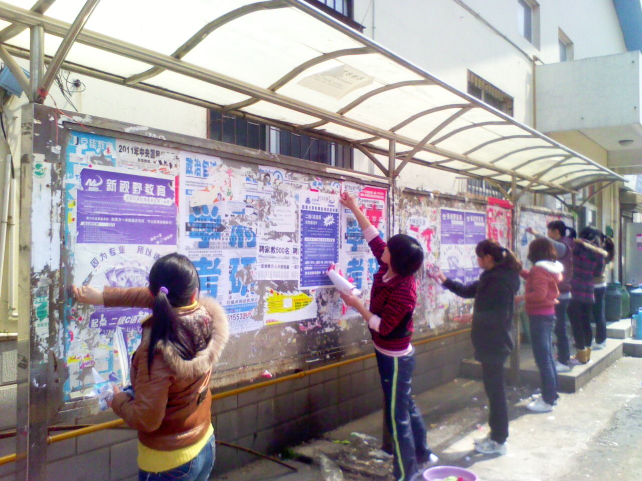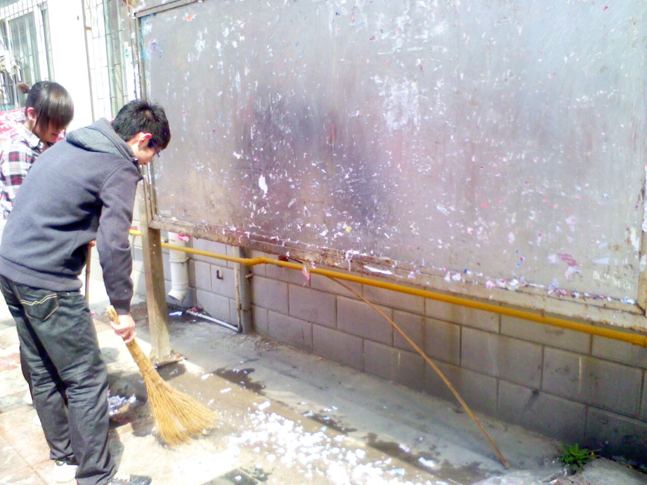大学校园里的展板和张贴栏等都是信息流通交流的重要平台,学生平常所获得的信息,比如校园通告通知﹑一些招聘广告等基本上都是通过这种方式了解到的。可这也带来了一些问题,即张贴栏上过时信息的处理,应该将上面过时的信息载体—纸清除干净,再张贴新的通告;还有一些随意贴着的广告,这些不仅不利于信息的传播而且还会对校园的美化产生不好的影响。因此,高分子专业党支部组织了这次清扫信息栏的义务劳动,地点主要在二食堂及水房附近。活动中间支部成员积极参与劳动,分工明确,拎水﹑擦洗﹑清扫碎屑等都有成员负责,互相配合。