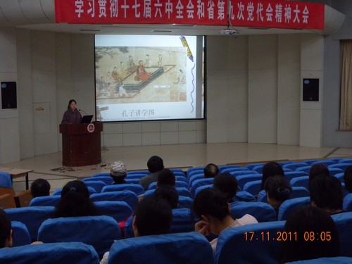 11月17日上午,图书馆党支部在学术报告厅举办了一场题为“十七届六中全会精神解读”的专题报告,由我馆思政专业硕士毕业生唐红晶老师主讲,图书馆全体工作人员参加了报告会。