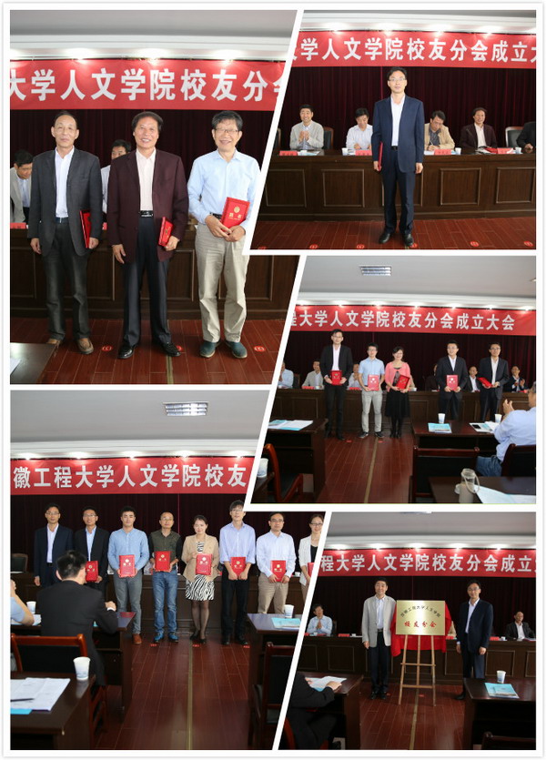 伊长文首先介绍了人文学院校友分会成立的背景以及筹备情况。随后,人文学院副院长刘军宣读了《安徽工程大学人文学院校友分会章程(草案)》,伊长文宣读了第一届校友理事会成员名单,全体与会人员热烈鼓掌通过。主席台就坐人员为理事会成员颁发聘书;曹安照和人文学院校友分会会长刘军共同为人文学院校友分会揭牌。