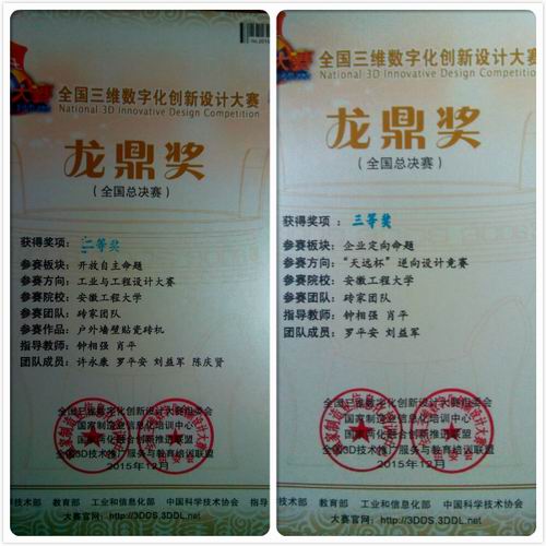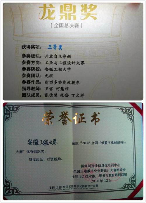 机械与汽车工程学院高度重视此次比赛,以三维数字化创新设计大赛为抓手,以3D创新协会为平台,全面提高学生创新设计能力。自3月份启动初赛,机械与汽车工程学院积极动员、精心组织。6月份经答辩等环节,最终10支代表队进入复赛。为进一步提高学生作品水平,暑假期间师生不惧高温,克服困难,对复赛作品进行集中完善。10月份参加安徽赛区大赛,获特等奖2项,一等奖3项,二等奖4项,三等1项,最终有2支队伍进入总决赛,取得了骄人的成绩,为参加下一届大赛奠定了基础。