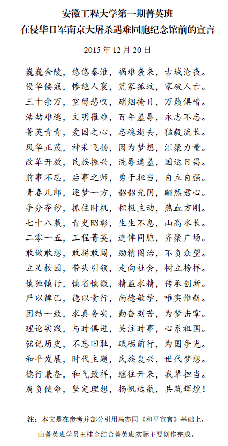在和平雕塑下,白鸽环绕天空,校学生处处长张开炳做了总结讲话。他指出,今年是中国人民抗日战争暨世界反法西斯战争胜利70周年,今年的南京大屠杀死难者国家公祭日刚刚过去一周,在这样的时刻,我们体验、缅怀这段悲痛的历史格外重要,也是菁英班学员应有的担当。张开炳强调,缅怀历史不是为了煽动仇恨,更不是为了宣扬报复,我们要在缅怀历史中学会反思,学会以史为鉴,反思和平的来之不易,珍视和平并捍卫和平。张开炳希望同学们勿忘中华民族曾经遭遇的不幸与苦难,勿忘无辜的遇难同胞,大力弘扬和践行社会主义核心价值观,主动将个人梦想汇入中华民族复兴的伟大梦想,坚定理想信念,勇于担当,砥砺前行,争当示范,坚持不懈。