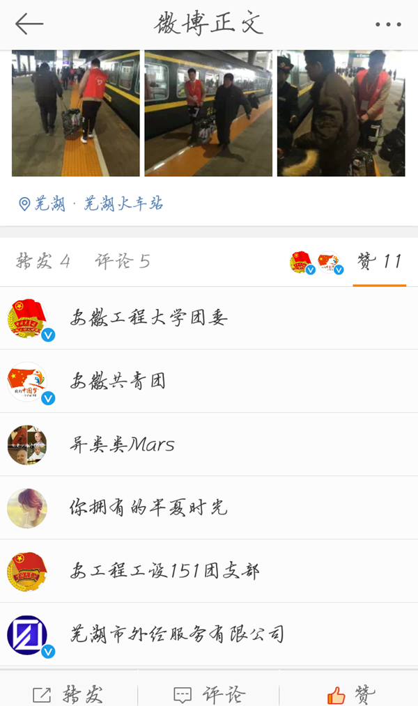 “暖橙甜他人,温暖传天下”,志愿者们帮助他人的热情和温暖他人的爱心,给南来北往的旅客留下了深刻的印象,获得旅客的赞扬和肯定,同时也得到社会媒体的广泛关注。《皖江明珠网》专访安徽工程大学志愿者,并进行专题播报。暖途的官方微博也得到了各界人士的广泛关注,留言评论,得到了安徽省共青团等官方微博、微信的“点赞”。