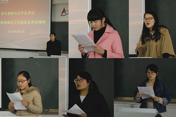 3月2日,校党委宣传部组织校广播台、校大学生记者站、校“双微”网络文化工作室全体同学及其指导老师在4J111教室召开座谈会,学习习近平总书记在党的新闻舆论工作座谈会上的重要讲话精神。校党委宣传部部长孙浩然出席。