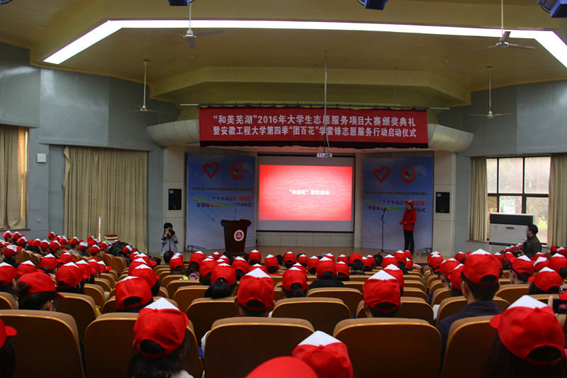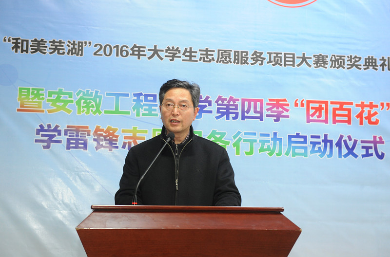 3月4日下午,“和美芜湖”2016年大学生志愿服务项目大赛颁奖典礼暨安徽工程大学第四季“团百花”学雷锋志愿服务行动启动仪式在学术报告厅举行。芜湖市民政局副局长刘萍、校党委书记陈其工、副校长郭兴众和校党委宣传部、学生处、校团委、马克思主义学院负责同志等出席仪式。仪式由校团委书记刘一主持。