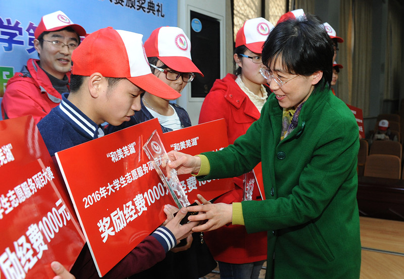 校学生处处长张开炳、芜湖市民政局副局长刘萍为获奖团队颁奖。校党委宣传部部长孙浩然、马克思主义学院院长李卫华为2015年十佳青年志愿者颁奖。获奖代表陈宇同学结合自己参与志愿服务活动和大赛的收获和感受发言。刘萍诠释了志愿服务精神,充分肯定了我校大学生志愿者为芜湖市文明城市、慈善城市创建所做的贡献,并对我校大学生志愿服务活动的开展情况给予了高度评价。