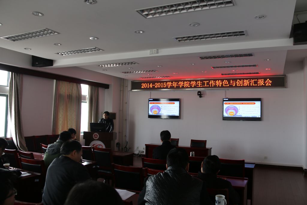 各学院汇报的特色与创新方面展现了学生工作千帆并进、丰富多彩、富有活力的工作姿态,如:机械学院的课外学术科技月活动,电气学院的构建新生适应性教育体系,纺服学院打造学生的人生导师队伍,生化学院服务学生考研、助力人才成长,管理学院专业竞赛引领学风建设,艺术学院的学生思想政治教育创新工作,计算机学院“三个课堂”协同培养创新人才,数理学院的本科教学质量月,人文学院的“水滴人文”新生同辈互助成长小组,外语学院的构建学生思想政治教育工作新格局,体育学院思想教育和学风建设新途径,建筑学院的精细化的日常教育管理。