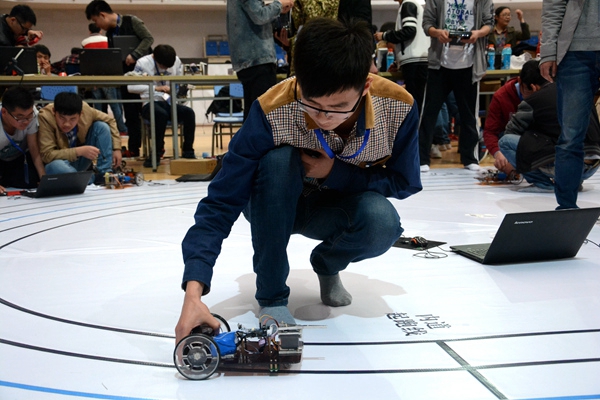 我校组织的四支参赛队伍参加了轮式机器人田径赛和仿人机器人单人舞蹈比赛。四支参赛队赛前积极备赛,可是临赛前参加轮式机器人田径赛的两辆车突然出现故障。参赛选手连夜修复了车子,及时赶到比赛现场调试数据,力争让参赛机器人发挥出最佳水平。参加机器人舞蹈的两支队伍在看过现场参加机器人舞蹈比赛的其他队伍的调试后,感到了很大的压力,经过考虑,两支队伍决定将原来的舞蹈动作全部推翻,重新选曲调试动作,经过一晚上和一上午的奋战,终于设计出一套完整的新颖动作,最后两支队伍在仿人机器人单人舞蹈比赛中获得两个三等奖。