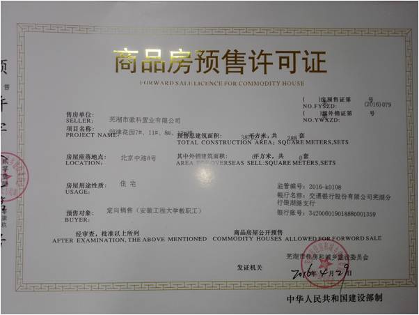 根据芜湖市商品房预售相关规定,徽科公司于今年3月份开始启动预售许可证办理工作,该工作涉及到芜湖市徽科置业有限公司营业执照年审、开发资质年审、前期物业招标、商品房预售方案、商品房住宅销售明码标价备案、开户银行预售款监督协议、商品房网上销售入网认证、房屋使用公约、物业项目规划设计方案等30多个材料,涉及到芜湖市规划局、国土局、财政局、工商局、人社局、人防办、建管处、房地产市场管理处、物业管理处、芜湖市房地产综合开发办等20多个行政主管部门,需盖各类行政审批章近30个,来回完善材料数十次,经过艰苦努力,终于实现校领导提出的在4月30日前争取办结商品房预售许可证的要求。