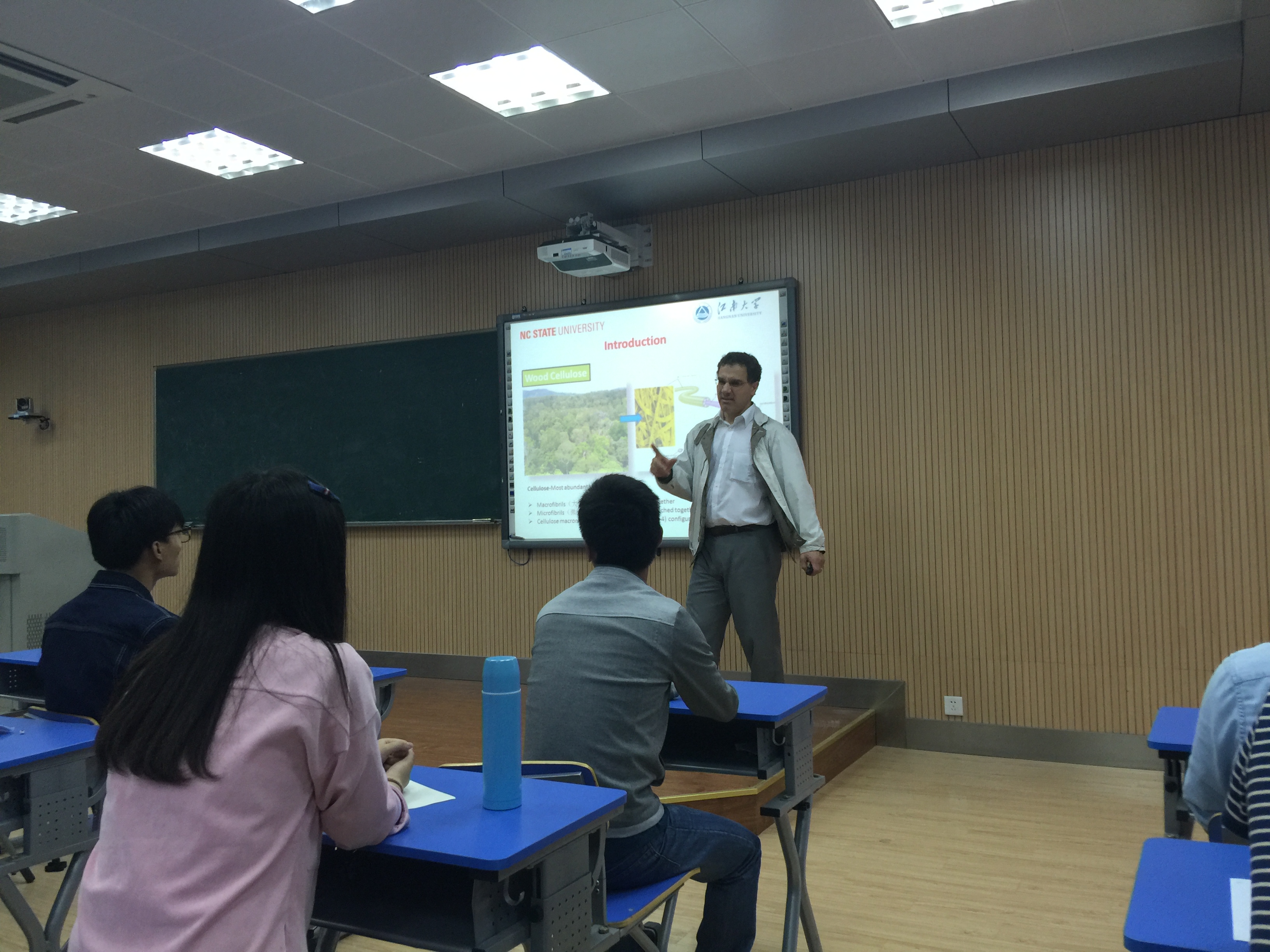 5月27日下午,在江南大学研究生院院长魏取福的陪同下,美国北卡罗来纳州立大学教授Lucian Lucia应邀来我校做学术报告。报告会由纺织服装学院副院长李长龙主持,学院相关专业教师和学生参加了报告会。