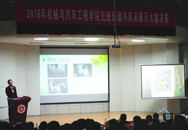 为进一步发挥先进班集体、优良学风班级的示范和带动作用,促进全院班风学风建设,5月31日,机械与汽车工程学院在学术报告厅隆重举行了学风建设先进班级评选及风采展示大赛决赛。校学生处学生资助管理科副科长汪隽、机械学院教师陶锋、徐振法担任评委,院党委副书记周怡、团委书记黄炜以及部分辅导员观看了比赛。