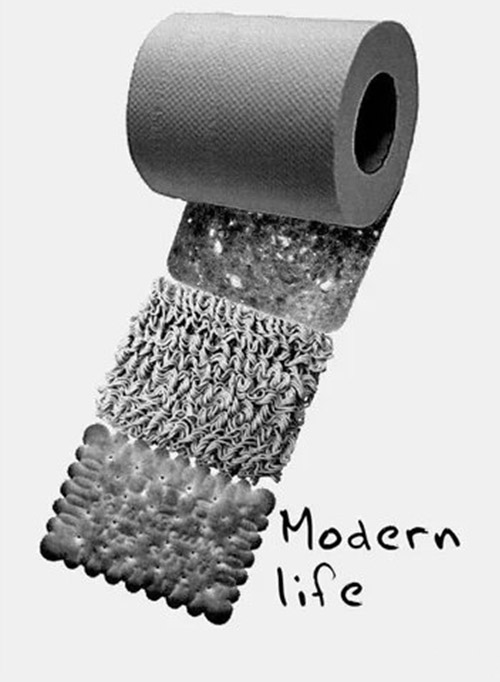 史启新老师入选的海报作品《Modern Life》,用卷筒纸进行隐喻,不提供营养,一片片撕下,用完丢进马桶。表达现代城市化的快速加工食品在为我们现代生活提供快捷和实用性的同时,也将大量的对人体有害的化学物质输入到我们体内,危害着我们的健康。