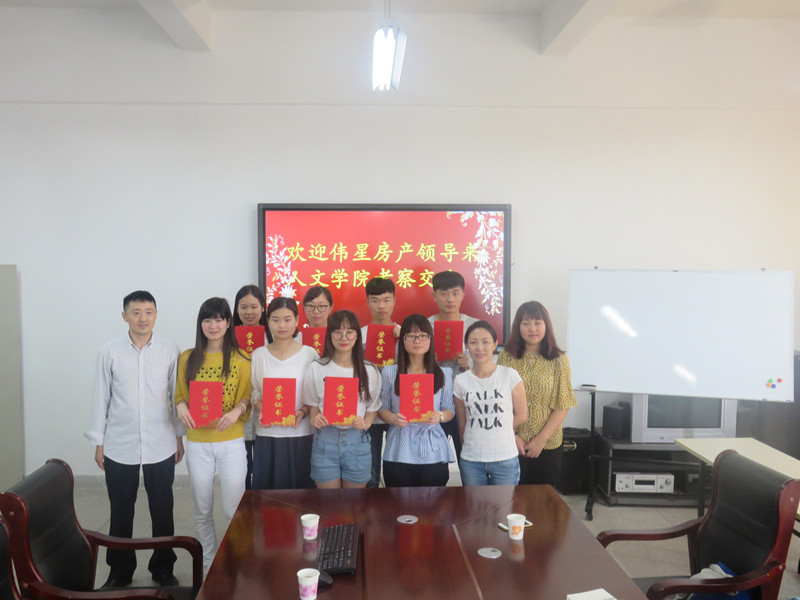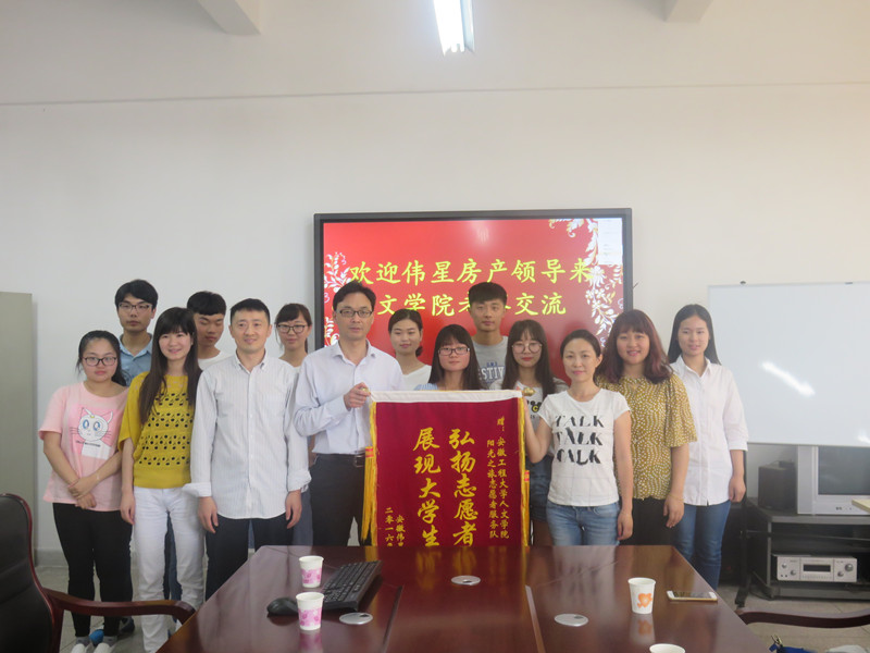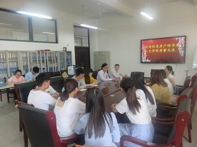 6月6日,芜湖市伟星房产策划部总监张蓉、媒体宣传负责人吕斐斐等一行3人来到人文学院考察交流,副院长刘军,团委书记黄江胜及“阳光之旅”志愿者服务队志愿者参加了会议。