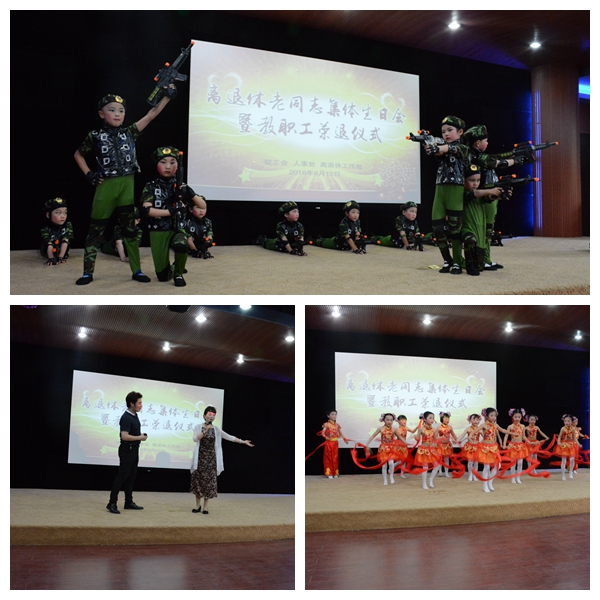 随后举行了新退休教职工的荣退仪式,陈其工、汪奇燕和相关部门领导为新退休的教职工颁发了荣退纪念品。退休代表潘安老师也激动地表达了对40年教学生涯、对学生同事的依依不舍之情,她表示虽然离开了工作岗位,但仍然会一如既往地关心学校发展,热爱美丽校园,积极树立退休人员的良好形象,优雅健康快乐地走进新生活。王河在活动开始前表示,学校党委行政高度重视和支持离退休工作,今年在为离退休老同志举办集体生日会的基础上,会同人事处为近期退休的教职工举行荣退仪式,是学校党委行政落实“两学一做”学习教育和省委关于进一步加强和改进离退休工作意见精神的具体体现,离退休党总支(工作处)将根据学校要求更加努力为广大离退休老师提供更多更好的关心和服务。