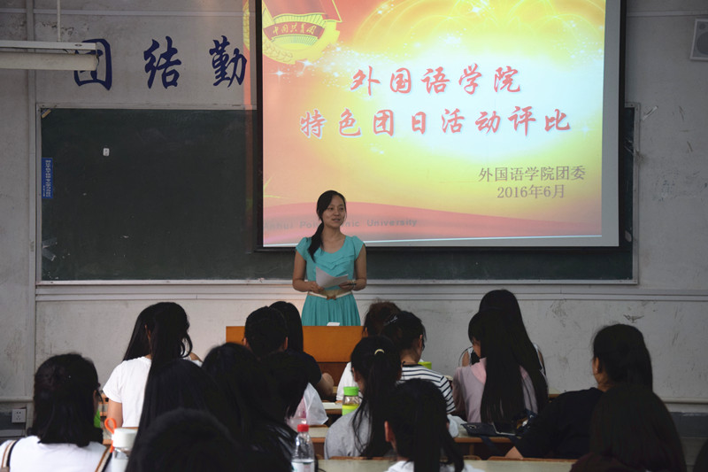 6月16日下午,由外国语学院团委举办2015—2016学年第二学期特色团日评比活动在二教204举行。院团委委员会成员和各班级骨干担任评委,院党委副书记谈丽华、团委书记余本祺、辅导员王钰和各支部团干参加了本次活动。