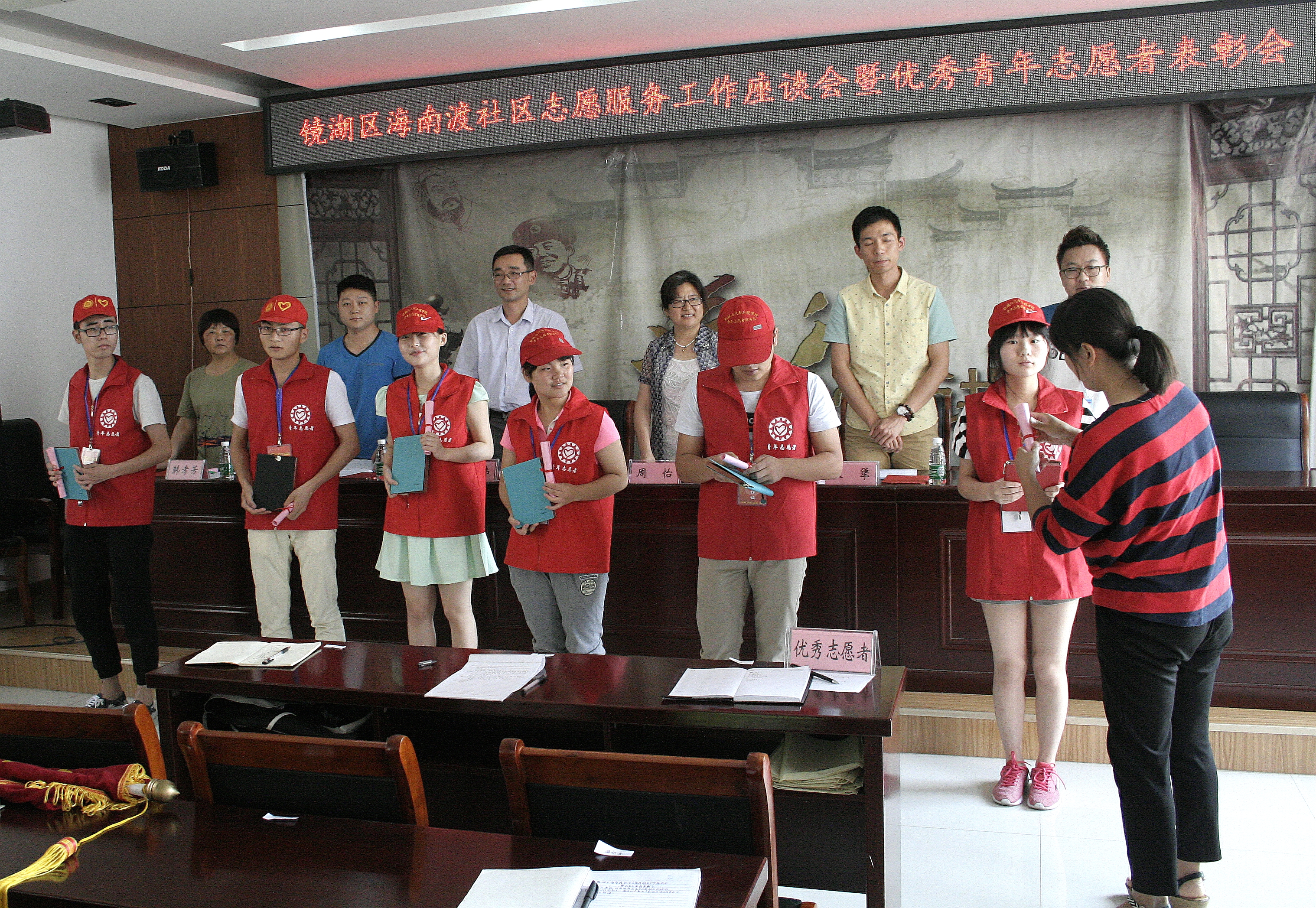 6月16日,芜湖市镜湖区海南渡社区志愿服务工作座谈会暨优秀青年志愿者表彰大会在海南渡邻里中心举行。机械与汽车工程学院党委副书记周怡、机械与汽车工程学院团委书记黄炜、镜湖区团委副书记张犟、海南渡社区主任梁钧、机械与汽车工程学院青年志愿者服务队全体队员参加了大会。