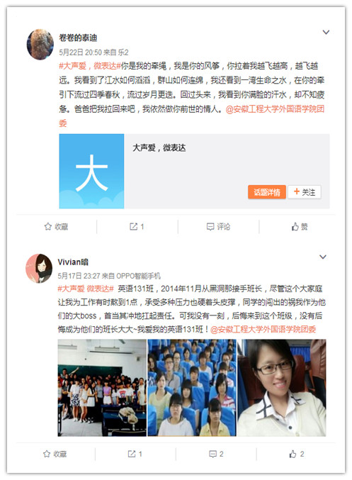 “多幸运最美的年纪遇见你,没有遗憾和可惜”、“一种爱,不求回报,是母爱;一个人,值得我爱,是母亲”、“5.25好好爱自己”……同学们在微博这一平台上用真挚而朴实的话语将纯洁的爱意、父母的感恩、自我的鼓舞大声表达,将爱意勇敢表达使青春不留遗憾。