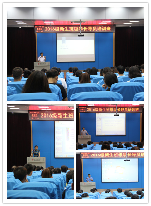 教务科科长任家钱首先介绍了我校学籍管理的相关规定,他分别从学分制、本科生学籍管理规定、授予学士学位工作细则、课程教学改革等方面详细解读了学校当前的学籍管理规定,帮助广大新生学长导员深入了解并掌握学籍管理规定,对新生有针对性地开展教育。宿舍管理中心主任李四军介绍了我校宿舍床位情况和住宿条件,对于新生比较关切的住宿问题进行了全面的解答;生化学院辅导员张宁从辅导员的角度谈了对于学长导员工作的理解,期待2016级的新生学长导员们能领会学校设立学长导员的初衷,积极向新生们传递爱学习、爱专业、爱学校的理念。