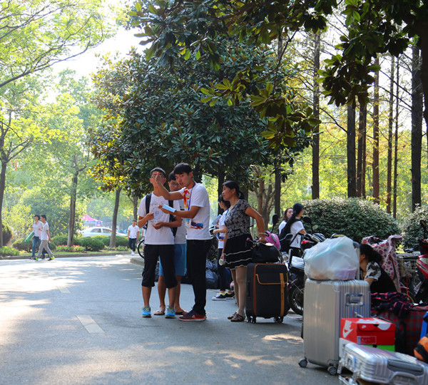 在迎新现场,各部门人员各司其职,来自院学生会各个部门的志愿者分布在不同的工作岗位,学校大门口、校车点、宿舍……学院的每一个角落都能看到志愿者们忙碌的身影。烈日炎炎,然而志愿者的热情依旧不减,他们按照报到流程有条不紊地工作着,努力为新生和家长们提供热情、周到、优质的服务。一辆辆校车驶入校园,等候已久的志愿者们高举着院系指示牌,帮助新生找到学院迎新点,接待处的志愿者们热情地引领新生进行信息登记,随后带领着新生找到各自寝室,并一路与新生及家长进行交谈,为新生和家长讲解安徽工程大学的学校概况和新生入学注意事项,消除他们路途的疲惫感与初来大学的陌生感。