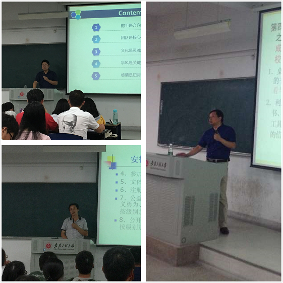 “我们是异父异母的一家人”,“每一个同学都是集体不可或缺的一部分”学院团委书记刘海涛以《班集体建设和学生干部培养》为主题分别从学生干部作用发挥、团队合作、文化建设、学风建设以及同学感情等五个方面阐述了班级集体建设和学生干部培养的重要性。他指出,学生进入大学首要的任务就是端正对大学的态度,明确大学是学习的地方而不是娱乐场所,而学生是班级的主体,一个优秀的班集体需要通过每一位同学的每一次微小的进步共同努力来进行建设。他强调,学生干部的首要任务还是学习,要时刻处理好与同学、与老师之间的关系,做老师和学生之间交流的纽带,更好的帮助老师进行班集体建设。