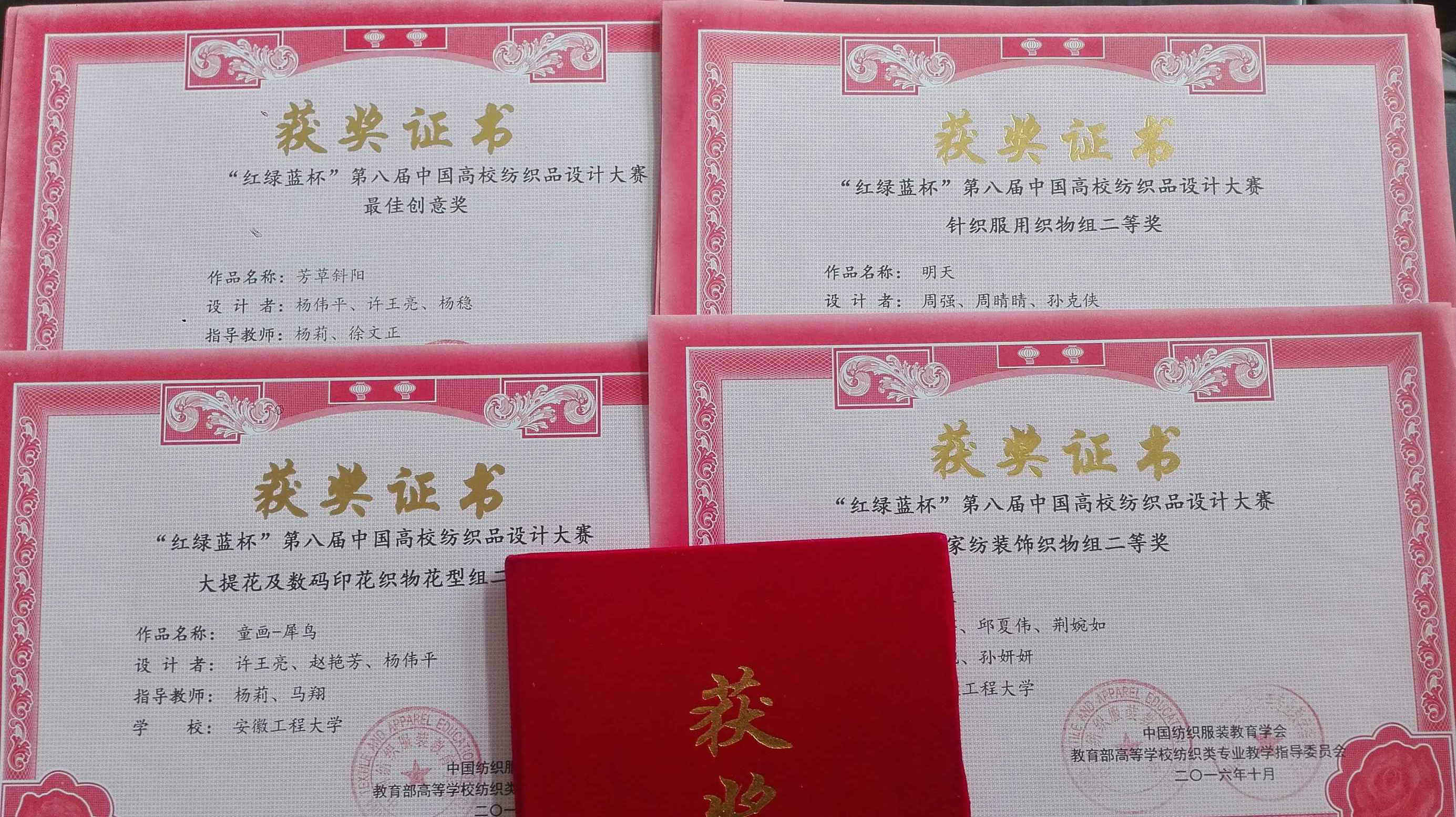 “红绿蓝杯”中国高校纺织品设计大赛由教育部、中国纺织工业联合会、中国纺织服装教育学会主办,是教育部纺织类教学指导委员会直接主办的中国高校设计比赛中最具影响力的传统赛事之一。本届大赛由绍兴县人民政府和绍兴文理学院共同承办。大赛共收到天津工业大学、西安工程大学、苏州大学、浙江理工大学等26所高校参赛作品911份。我校纺织服装学院对于该项传统赛事给予了高度的重视,王旭、杨莉等老师暑假期间与学生一起在实验室反复的修改、完善,选送了23幅作品参加大赛的角逐,最终取得了2个单项奖,5个二等奖,4个三等奖的好成绩。