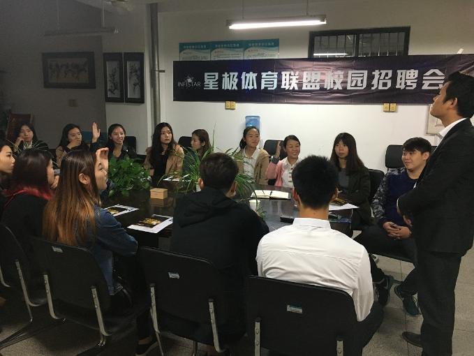 10月25日,体育学院2017届毕业生首场招聘会在学院会议室举行,星极体育联盟叶老师、体育学院团委书记王彦青、毕业班辅导员黄蓉静和数十名毕业生一起参加了招聘工作。