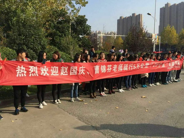 2016年是中国工农红军长征胜利80周年,为缅怀革命先烈的丰功伟绩,弘扬红色长征精神,挖掘其时代价值,人文学院退休教师赵国庆、曹锦芬夫妇以骑行的独特方式,感受永垂不朽的长征精神,重温经典红色文化。11月15日下午,赵老师夫妇抵达学校,人文学院党委书记邓英扣、部分教师及近百名学生在学校东门迎接他们凯旋归来。