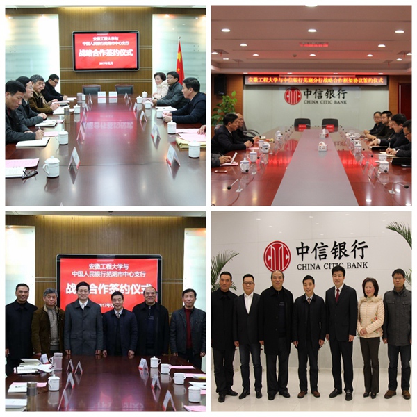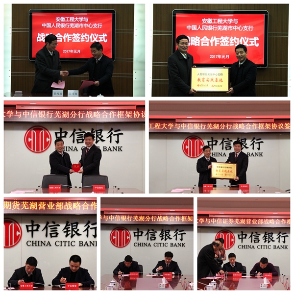 1月6日下午,我校与中国人民银行芜湖市中心支行、中信银行芜湖分行战略合作框架协议签字暨实践教学基地揭牌仪式分别在中国人民银行芜湖市中心支行、中信银行芜湖分行举行。校党委副书记、校长刘宁,我校数理学院党政领导,中国人民银行芜湖市中心支行中支党委书记、行长、芜湖市金融学会会长王林,中支党委委员、副行长姚平,中支党委委员、纪委书记、芜湖市金融学会副会长殷芳臻,中信银行芜湖分行行长张金山,副行长杨镭、童俊,中信证券芜湖营业部副总经理郭景宝,中信期货芜湖营业部副总经理徐亮出席了签字仪式。签字仪式由数理学院院长费为银主持。