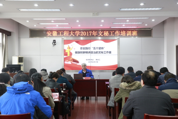 3月17日,校党委书记陈其工在行政楼1121会议室为文秘工作培训班做专题辅导报告。办公室、组织部、宣传部负责人及培训班全体学员聆听了报告。报告会由办公室主任王弘主持。