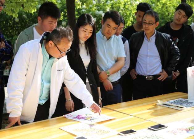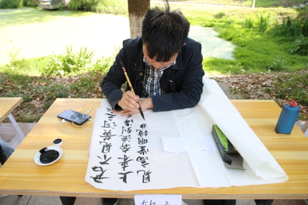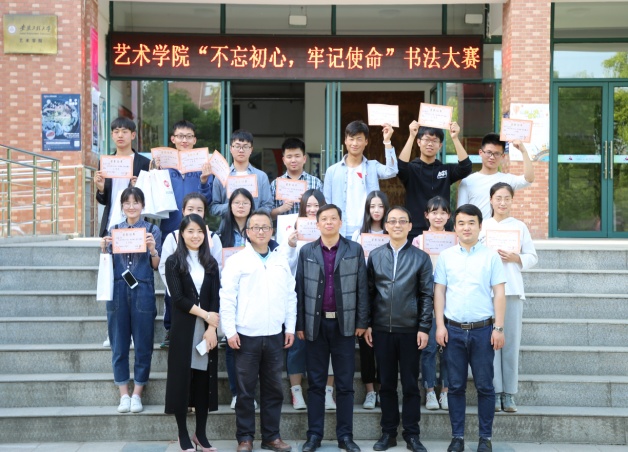 为践行十九大精神,弘扬优秀传统文化。4月18日下午,艺术学院在7号教学楼门前露天举办以“不忘初心,不负使命”为主题的书法大赛大赛分为硬笔、软笔和POP字体设计三组,比赛采用现场创作现场评审的形式,参赛选手先进行为时1小时的现场创作,后由观众投票以及评委打分决出胜负。比赛期间,硬笔书法中,作品风格迥异,各具风采;软笔书法中,选手们文房四宝齐上阵,笔走龙蛇,引得过路行人驻足旁观,观众无不惊叹。POP字体设计更是考验了参赛选手的想象力和思维的跳跃性。