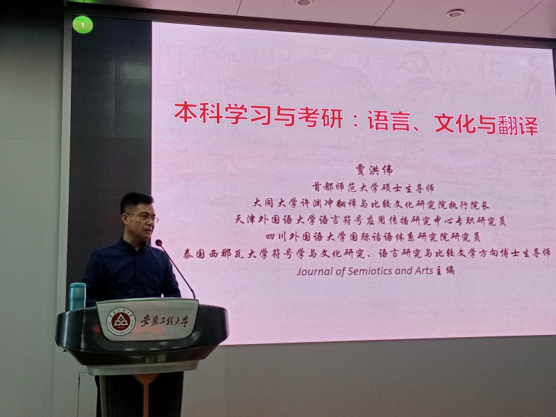 本网讯 10月31日下午,首都师范大学副教授、联合培养博士生导师、中国知网国际出版中心翻译质检专家贾洪伟应邀来校作题为“本科学习与考研:语言、文化与翻译”的学术讲座。讲座由外国语学院英语系主任李新国主持,院长黄焰结与相关专业师生聆听了此次讲座。