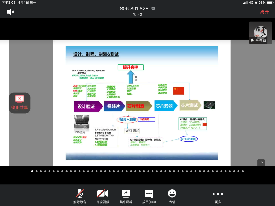 余先育介绍了半导体设计、制造、封装和测试的全过程,重点介绍电子级硅片的制造过程,裸硅片量测设备及应用范围,量测设备的前道制程工艺,缺陷检测设备的分类等,同时对国内相应的头部公司(科创板公司)做了相应介绍。