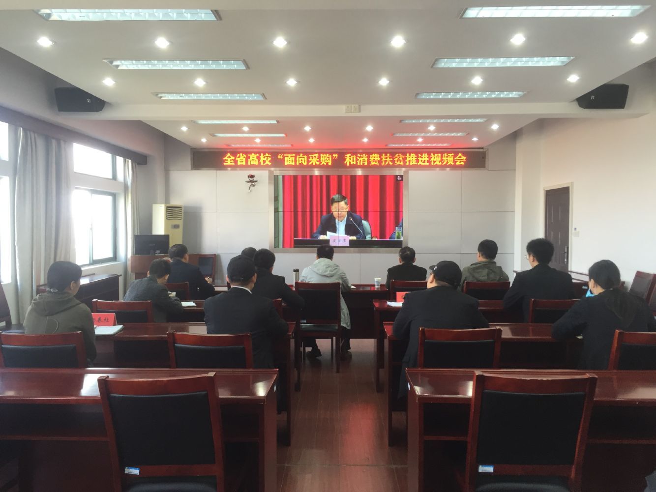 本网讯 为深入贯彻落实中央及安徽省关于脱贫攻坚和消费扶贫的一系列决策部署,总结交流“面向采购”实施两年来的典型经验,梳理分析面临的问题,对高校“面向采购”和消费扶贫工作进行再动员、再部署,助力打赢脱贫攻坚。近日,省教育厅、省扶贫办召开全省高校“面向采购”和消费扶贫推进视频会议,会议由省教育厅副厅长解平主持。学校党委委员、副校长郑健,工会、财务处负责人,后勤保障处相关人员参加视频会议。
