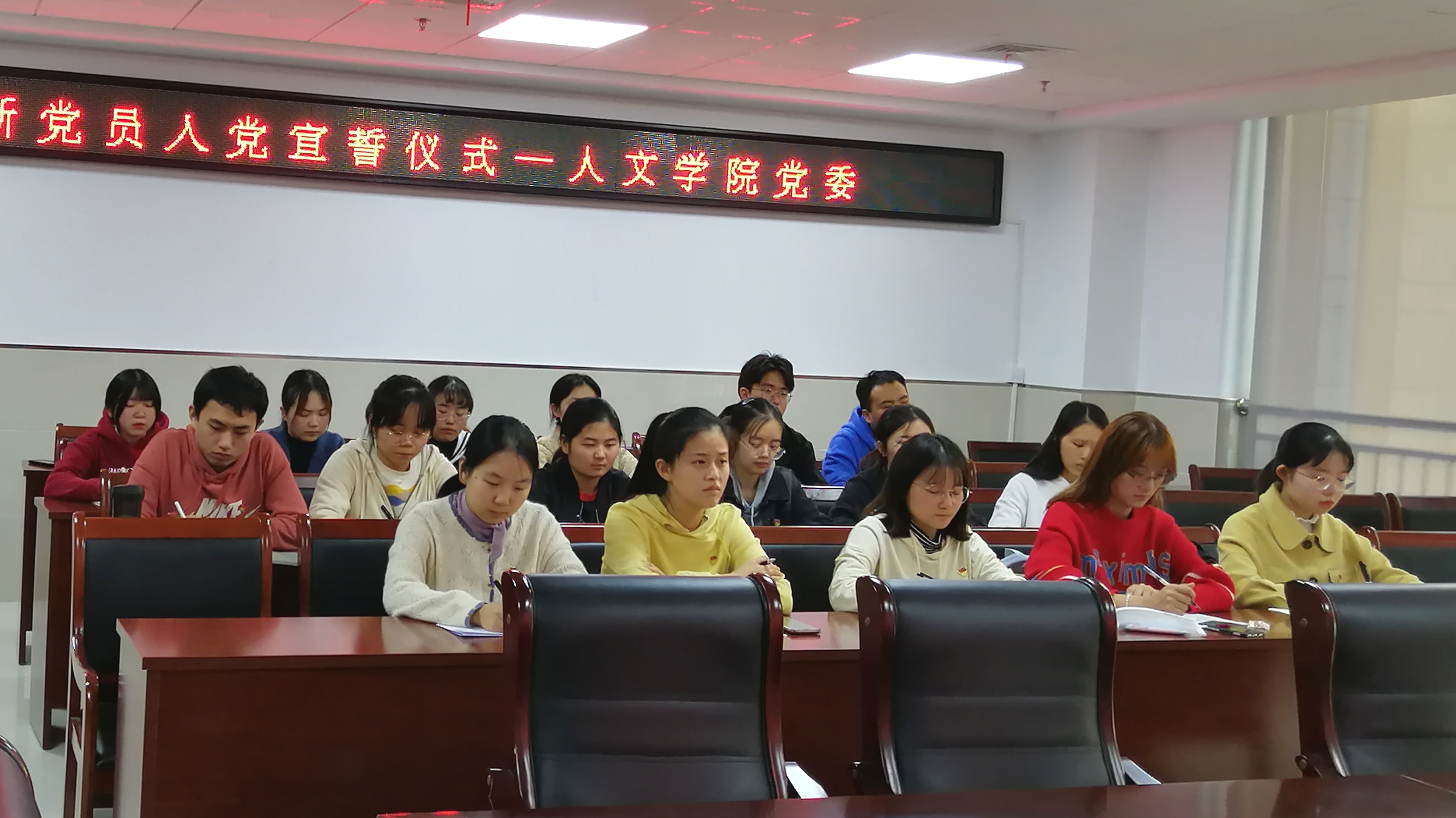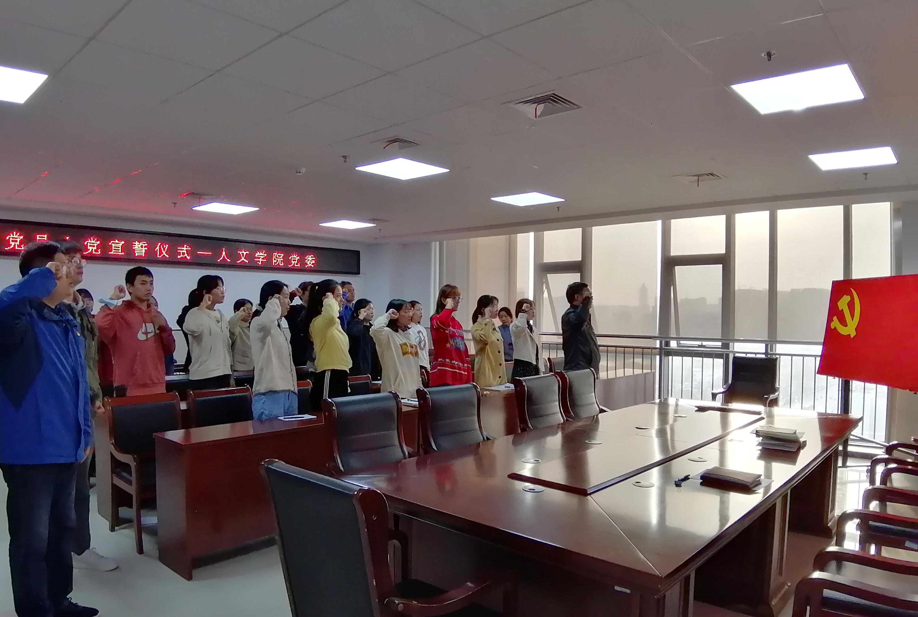 本网讯 为加强党员教育培养,继承和发扬党的光荣传统,贯彻落实习近平总书记考察安徽重要讲话指示精神,10月22日下午,人文学院党委在学院1307会议室隆重举行新党员入党宣誓仪式。党委书记邓英扣,党委组织员、学生党支部书记以及17名新发展的预备党员共同参加。