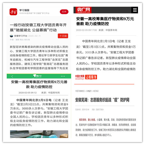 今年新冠疫情发生后不久,学院志愿者团队积极响应党的号召,发起“驰援湖北 公益募捐”活动,他们借助互联网在微信朋友圈、QQ空间,向广大师生与社会人士介绍一线疫情及物资急需情况,发起公益募捐并建立专题网页和“进度公示群”,便于参与募捐者及时跟进到善款使用情况、物资输送情况。30多天的时间里,团队直接和带动安徽工程大学师生筹集近20万元资金,对接18所高校爱心团队和社会公益组织,联系采购近十批医疗物资,及时送达20多家湖北基层医院。同时,他们还协助校医院收集国家批准的正规医疗物资生产厂家、销售商供货信息或防控物资。相关事迹不仅学习强国、央广网、中国文明网、中国青年报、中国教育新闻网、安徽共青团、安徽教育网等媒体进行关注报道,山东大学共青团、自媒体“补壹刀”等也对募捐事迹进行报道。团队队长也荣获2019年度“全国优秀共青团员”。