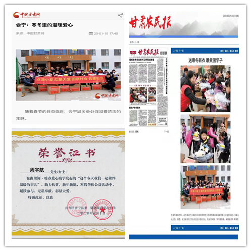 学院“公益N+1”团队以爱心助学为己任,团队于2019年11月发起爱心衣物、学习用品捐赠活动,向甘肃省会宁县、安徽省利辛县、河南省郏县贫困儿童捐赠200余件学习用品,1700余件秋冬季衣物。2020年4月发起爱心助学活动,目前已对接10位贫困学生(6名甘肃省会宁县、4名安徽省亳州市),每月资助其200—500元助学资金,持续三年,截止目前已有120余位来自清华大学、南开大学、南京航空大学等国内二十多所高校的志愿者参与其中。事迹先后被中国甘肃网,甘肃农民报报道,团队成员也被甘肃会宁县团委授予“爱心志愿者”。