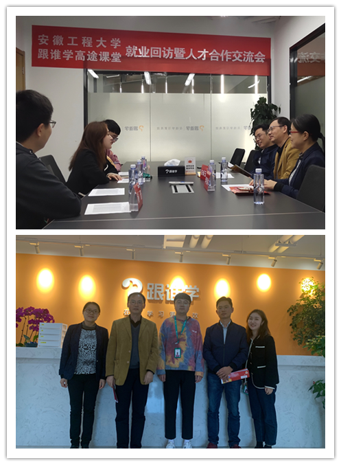 在安徽跟谁学教育科技有限公司,校招负责人焦佳琪介绍了在线教育行业的发展趋势、公司在安徽发展的战略布局以及人才总体需求,对我校毕业生优秀的综合素质给与高度肯定。毕业生代表杨涛从企业文化、个人成长经历等方面分享了入职后的感受,对学院的人才培养和就业工作提出了宝贵意见建议。通过座谈,校企双方就毕业生录用标准、员工职业培养路径以及就业协议签订等问题展开深入交流,就共建毕业生就业实习基地达成共识。