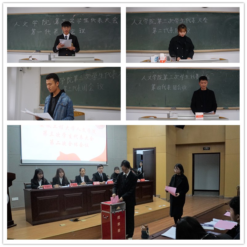 大会听取和审议了人文学院学生会工作报告,报告总结了这一年院学生会工作所取得的成绩,指出了学生会工作的不足,并对未来一段时期工作提出展望、承前启后,继往开来。大会提出,学生会要进一步加强自身建设,加强社会主义核心价值观的践行和引领,落实好为学生服务的工作宗旨,不断完善工作体系,搭建工作平台,更好团结广大学生,进一步开创学院学生工作的新局面。大会选举产生了第三届安徽工程大学人文学院学生委员会,江周等15人当选新一届学生委员会委员。会议通过了关于学生会工作报告决议。随后,召开了人文学院第三届学生委员会第一次全体会议,至此,此次学生代表大会圆满落下帷幕。