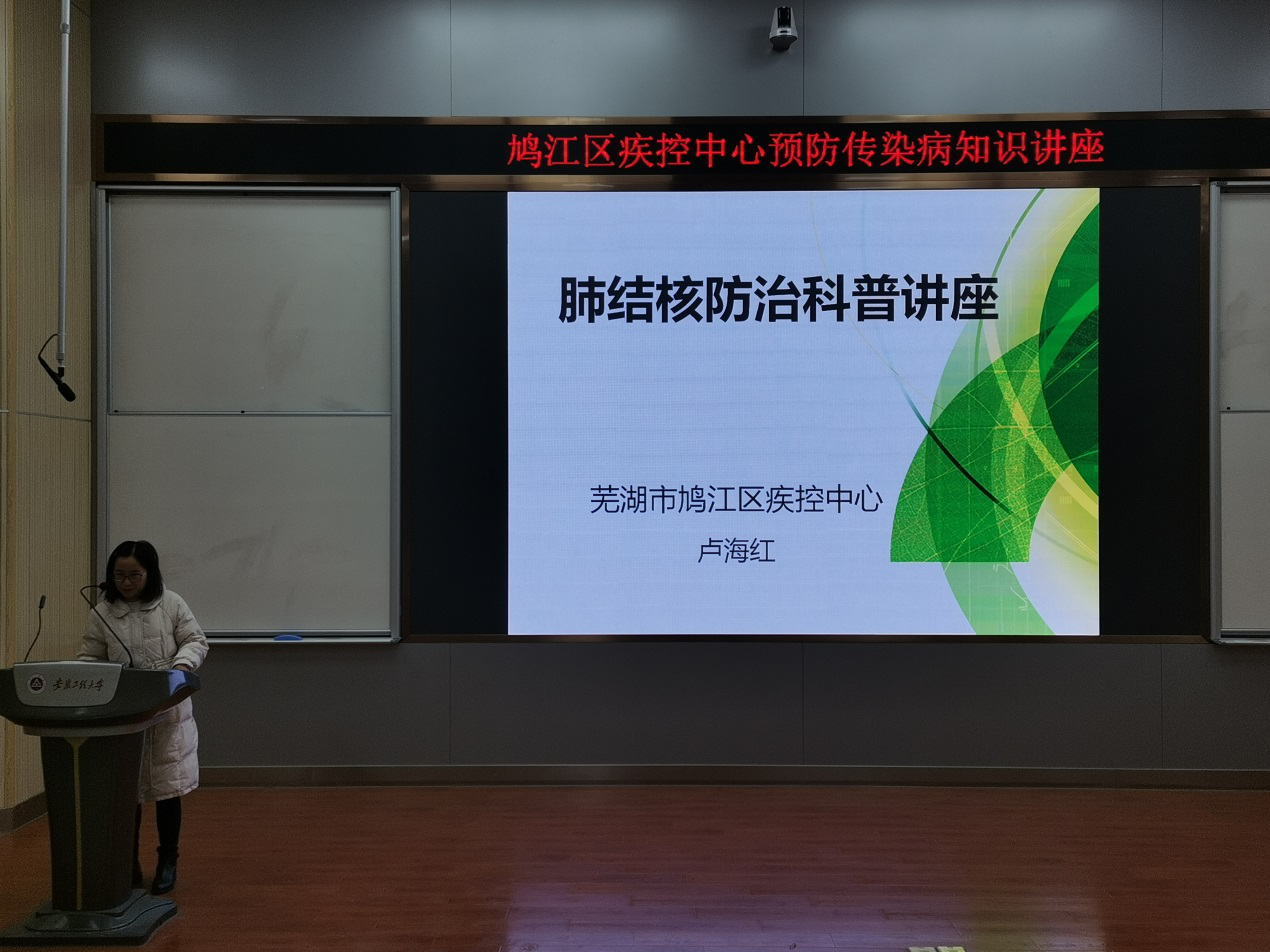 本网讯 为提高同学们对传染病的预防意识,增加预防知识,保护自身健康,2020年12月9日,校医院邀请鸠江区疾控中心专家在2教报告厅开展预防传染病知识讲座。