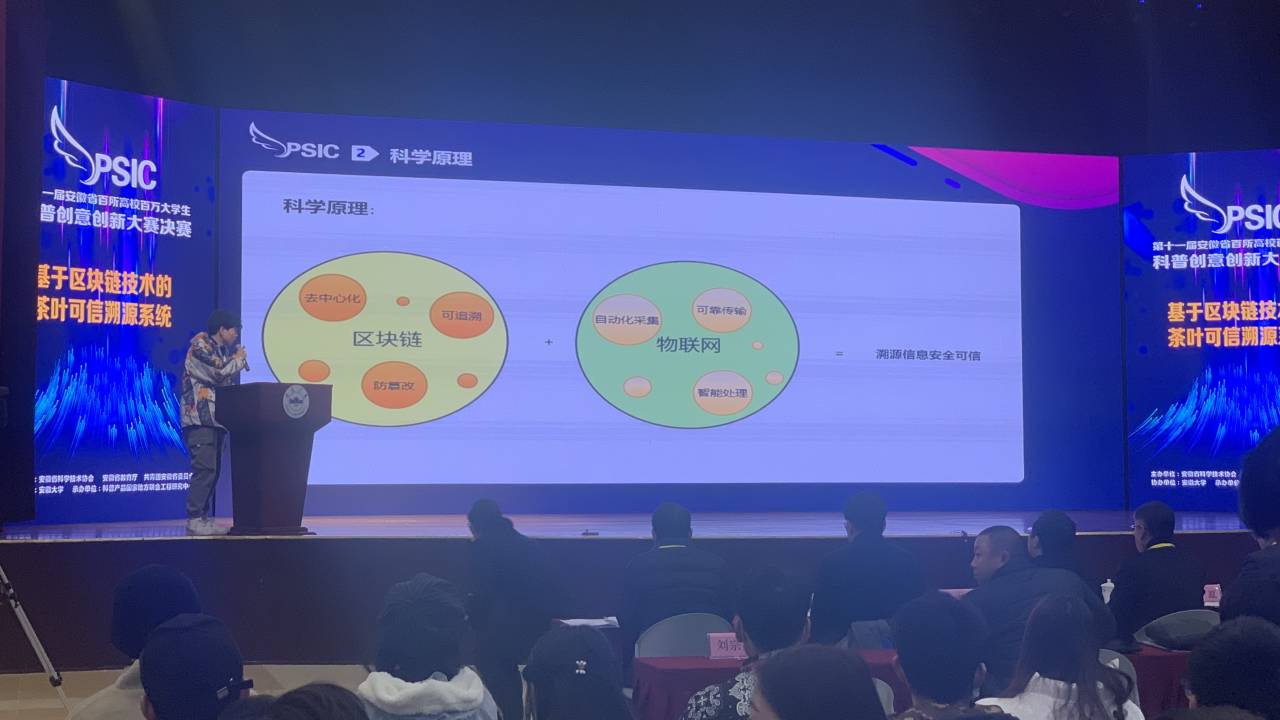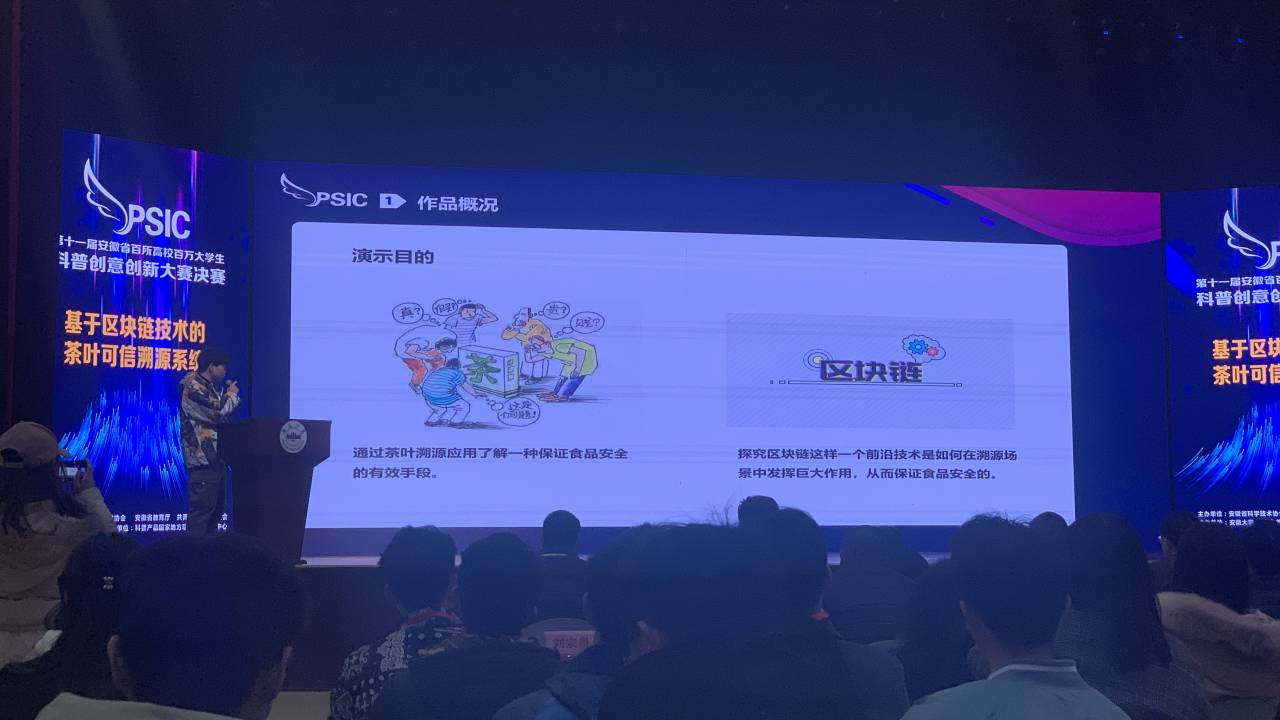 本网讯 12月5日,第十一届安徽省百所高校百万大学生科普创意创新大赛(以下简称“双百大赛”)终审决赛在安徽大学隆重举行,安徽工程大学作品《基于区块链技术的茶叶可信溯源系统》经过层层选拔,入围终审决赛,并且凭借出色的现场展示和精彩答辩获得大赛一等奖。本届大赛以“科技传播与创新创业”为主题,大赛由省科协、省教育厅、团省委联合主办,安徽大学协办,共有来自合肥工业大学、安徽大学、安徽医科大学等71所高校2139件作品参赛。经过层层选拔,最终确定20件作品参加终审决赛。