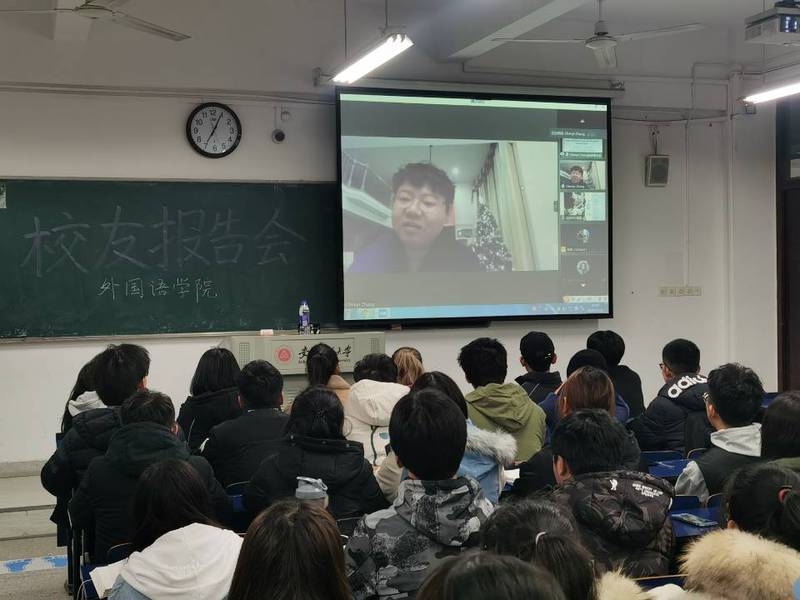 本网讯 为充分发挥优秀校友的典型示范作用,引导同学们更好地做好职业生涯规划,12月13日晚上,外国语学院在5教503举办了校友线上报告会。外国语学院2005届英语系毕业生——美国乔治亚州立大学终身教授张琛奕,围绕“成长”与“成功”两个关键词,从两者之间的关系、成长模式、成长秘诀提升等几个方面应邀为2020级本科生做了一场精彩的线上报告。报告会由学院2020级辅导员张君主持。