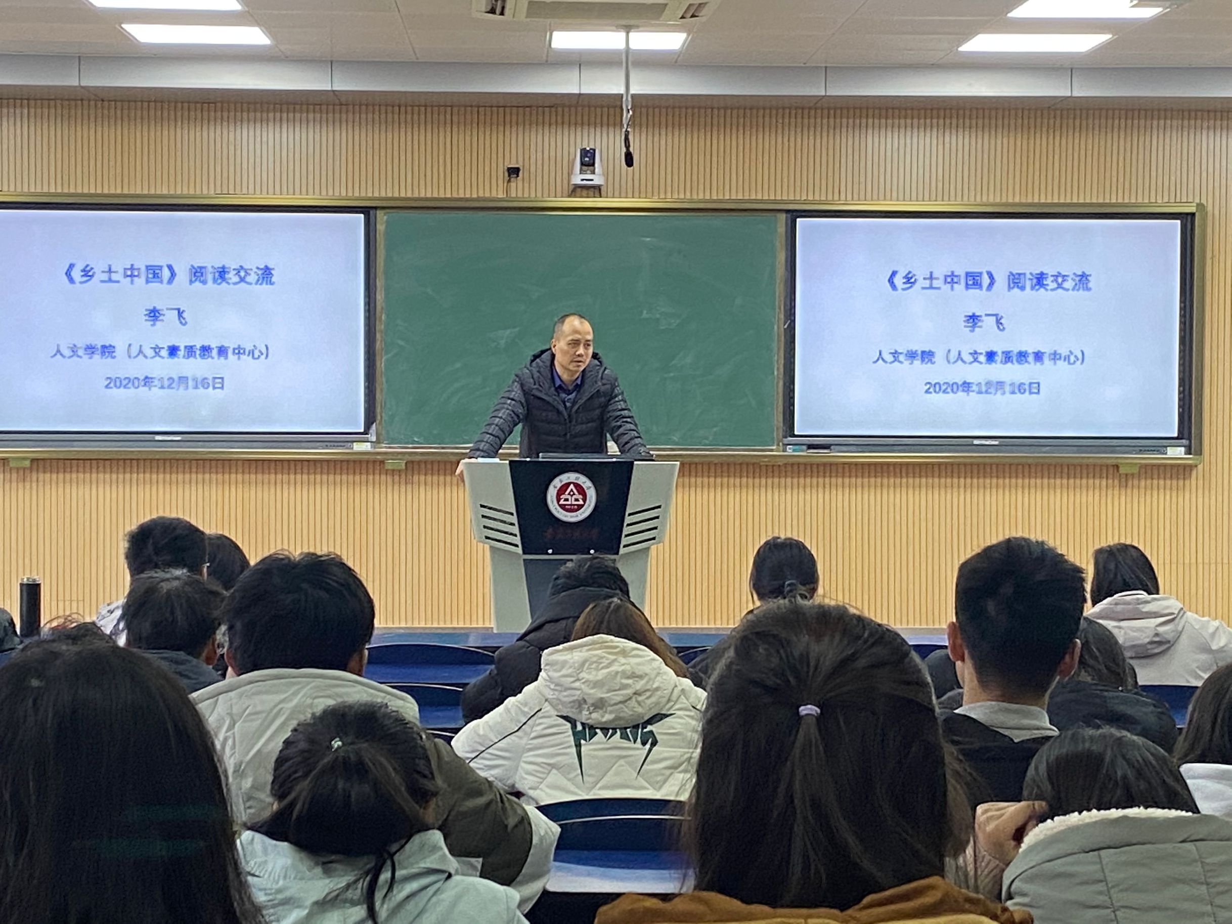 本网讯 12月16日下午,校“经典阅读”班举办“师生共读一本书”阅读分享会,人文学院副教授李飞博士与“经典悦读”班的全体同学一起分享了费孝通的经典作品《乡土中国》。