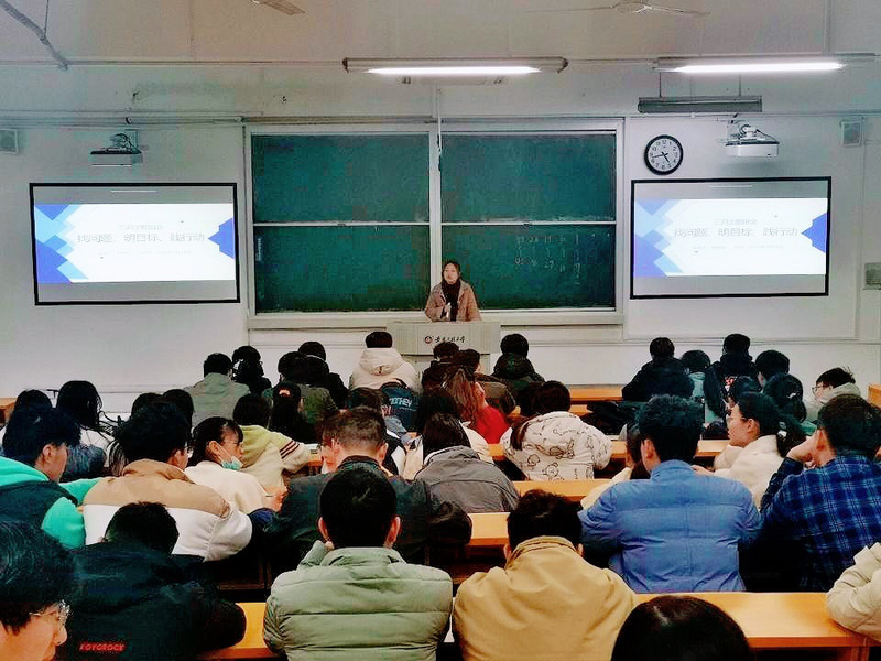 2019级主题班会上,辅导员何祥玲以政治理论学习和学情分析为内容进行思想引领和学习指导。针对19级上学期班级总体情况整理了各班的学情分析数据,带领同学们详细总结和分析,使各班级认识差距,寻找动力,不断提高。结合大二学生的学业特点,她要求同学们提高思维高度,学会找自身问题,要开始思考未来发展方向,逐步明确目标。