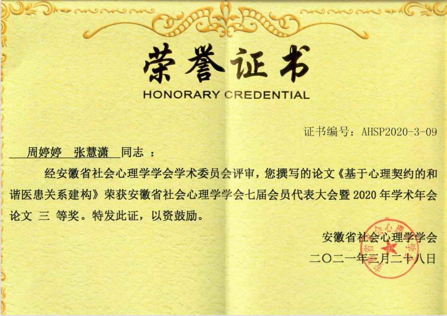 本次会议以“美好安徽建设与社会心理服务”为主题,与会专家学者通过主题报告、馨苑论坛、青年论坛等形式,围绕会议主题进行了深入的交流与探讨。由金艾裙教授指导、社会工作专业研究生周婷婷和张慧潇撰写的论文《基于心理契约的和谐医患关系构建》,获安徽省社会心理学学会第七届会员代表大会暨2020年学术年会论文三等奖,2020级MSW周婷婷同学在会议青年论坛做了汇报与分享,得到与会学者的肯定,展现了人文学院研究生的培养成效。