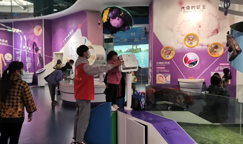 科技馆游客大多是父母带着孩子。志愿者在提醒孩子们注意安全的同时耐心地为他们讲解各种科学知识和技术,引领他们探索科学的奥秘。科技馆中有很多科学知识过于专业,志愿者就发挥自己的聪明才智,结合专业知识,将难以理解的知识通俗化表达,用肢体语言和生动故事诠释晦涩的原理,带领孩子们推开科技的大门。科技馆还专门为儿童打造“儿童科学乐园”,这里有“小小建筑师”“滚球过山车”等游戏,志愿者耐心引导每一个孩子有序进入体验区域,让孩子们在玩耍中体验科技的奇妙。