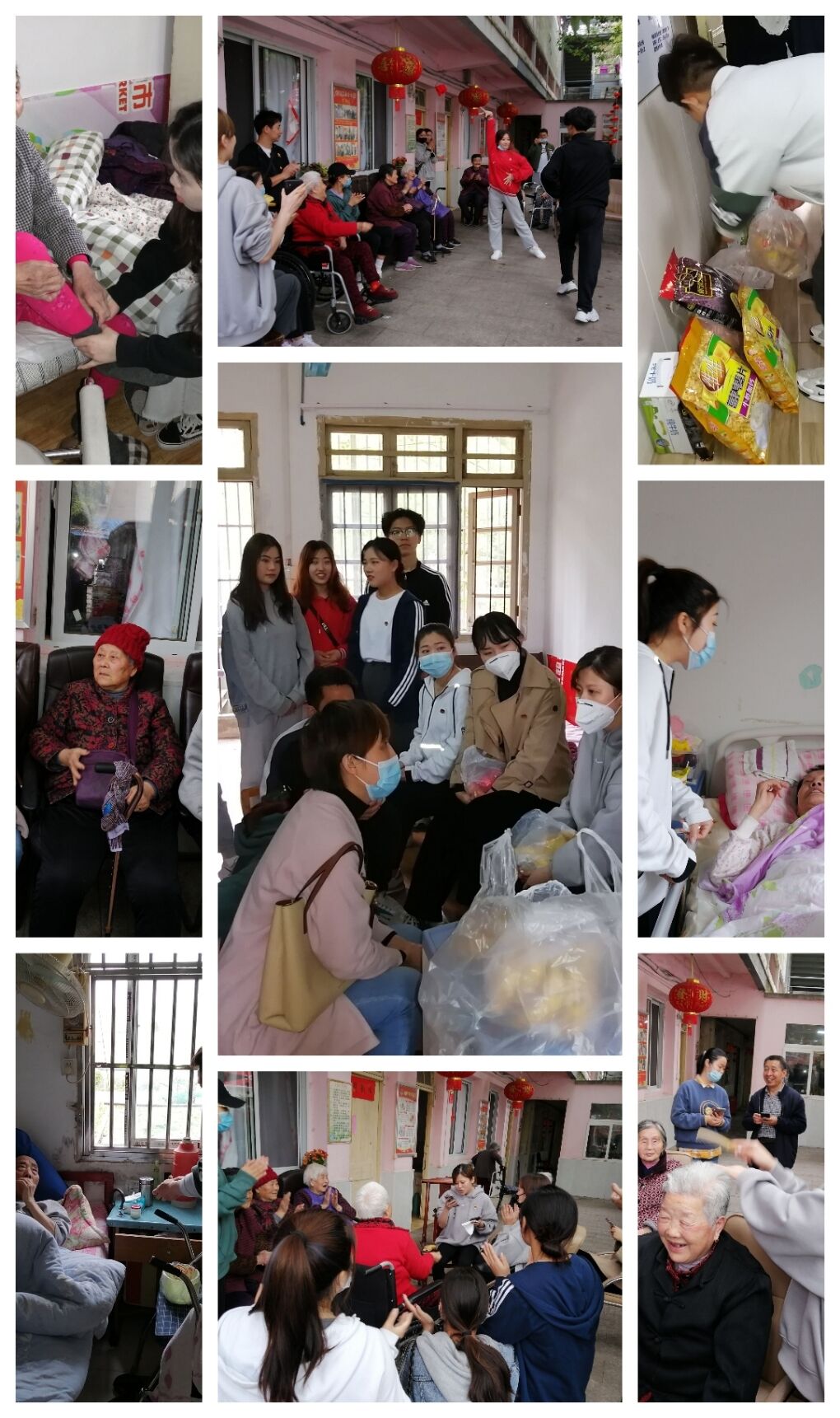 同学们为老人梳理了头发、整理了衣服、打扫了卫生,和他们一起唱红歌,为他们送上了两段拉丁舞表演,老人与同学们一起拍手打节拍,哼着歌曲,扭动着身躯,气氛一片热闹祥和。