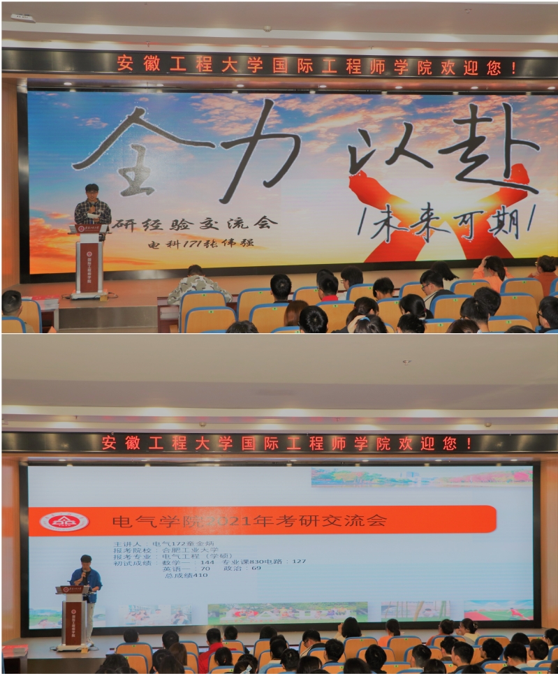 本网讯 4月25日晚,电气工程学院2021年考研经验交流会在国际工程师学院大报告厅举行。学院党委书记杨会成参加会议,并作动员讲话。会议邀请了6名今年成功录取硕士研究生的2017级学生作主题分享。