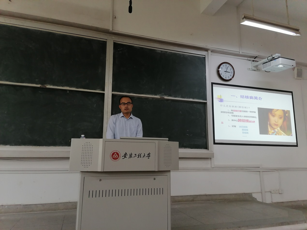本网讯 为普及我校大学生结核病预防知识,提高学生自我防范意识,促进良好卫生习惯养成,4月28日下午,后勤保障处校医院邀请芜湖市疾控中心专家彭伟副主任医师来校开展大学生结核病防控知识讲座。150余名同学到场聆听了讲座。
