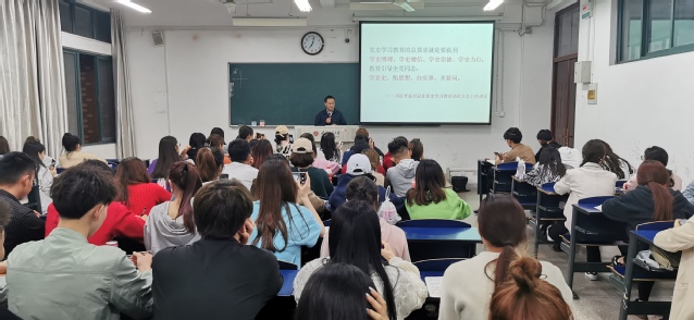 本网讯 4月28日晚7点,体育学院党总支书记杨善祥在6教208教室为各班级学生代表、研究生代表上了一堂题为“学史增信”的党史教育专题党课。